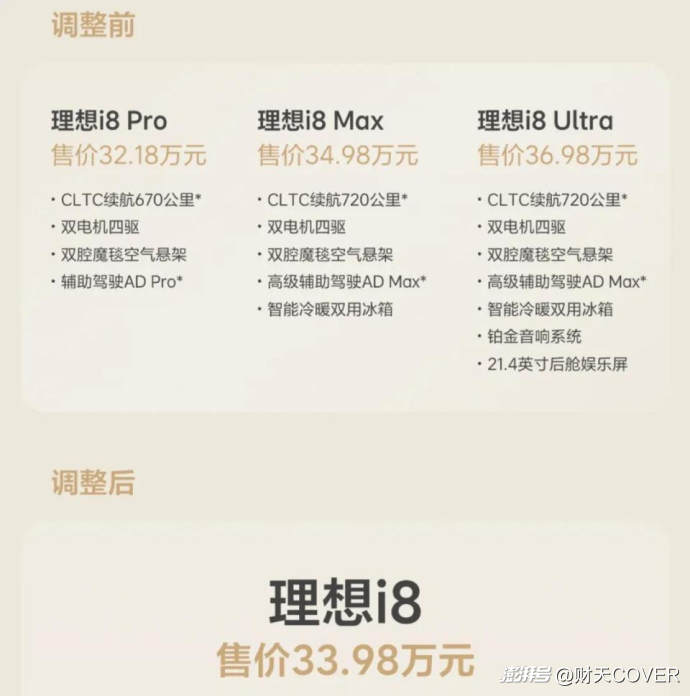 8月5日午間,理想汽車宣布將原先的三個車型整合為一個“標準版”,官方指導(dǎo)價33.98萬元。此前理想i8共推出了Pro、Max和Ultra三個車型,售價分別為32.18萬元、34.98萬元和36.98萬元。