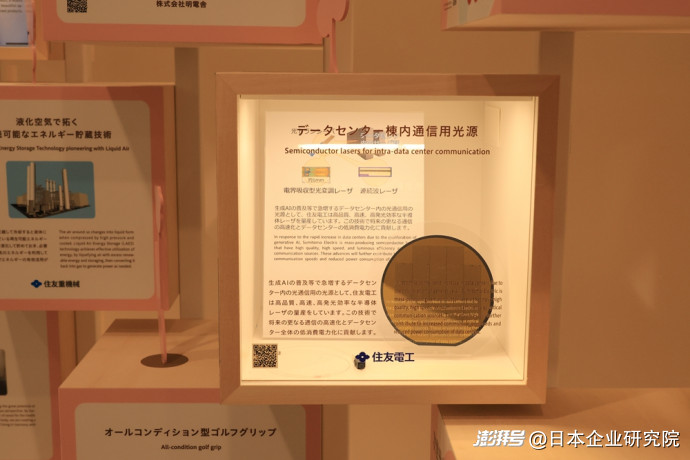 住友電工的展品都緊扣世博會“未來社會的實驗場”主題。如“數(shù)據(jù)中心樓宇內(nèi)通信用光源”,就是呼應(yīng)當(dāng)前和未來生成式AI市場的需求,專門開發(fā)出來的用于樓宇內(nèi)高品質(zhì)、高速通信需求而開發(fā)出的產(chǎn)品,能夠應(yīng)用于未來更大通信量、更高速度的數(shù)據(jù)傳送,同時又具有消費(fèi)電力少的特點(diǎn)。