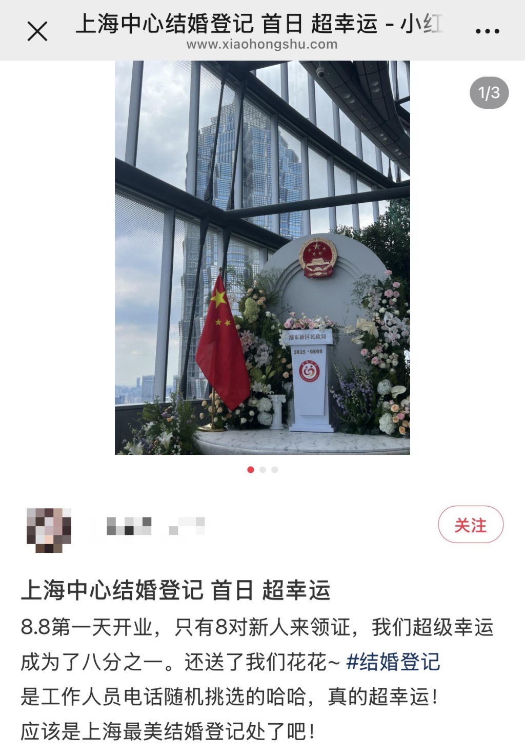 8月8日上午,有網(wǎng)友在社交平臺(tái)發(fā)帖稱在上海中心完成結(jié)婚登記。 社交平臺(tái) 截圖