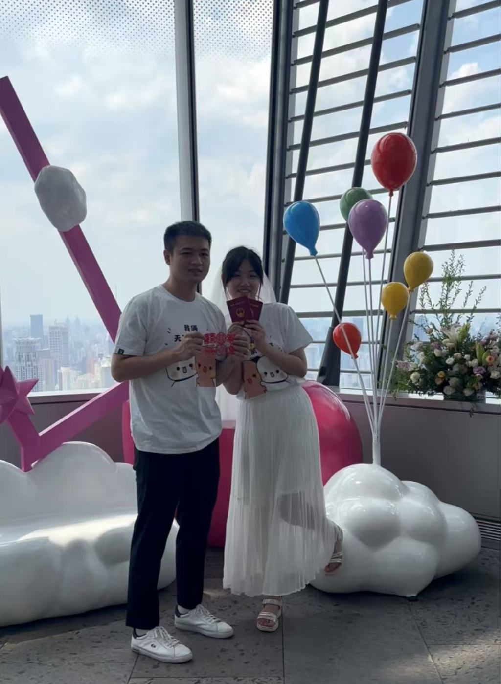 8月8日,李先生和郭女士在上海中心52層領(lǐng)證后,拍照留念。