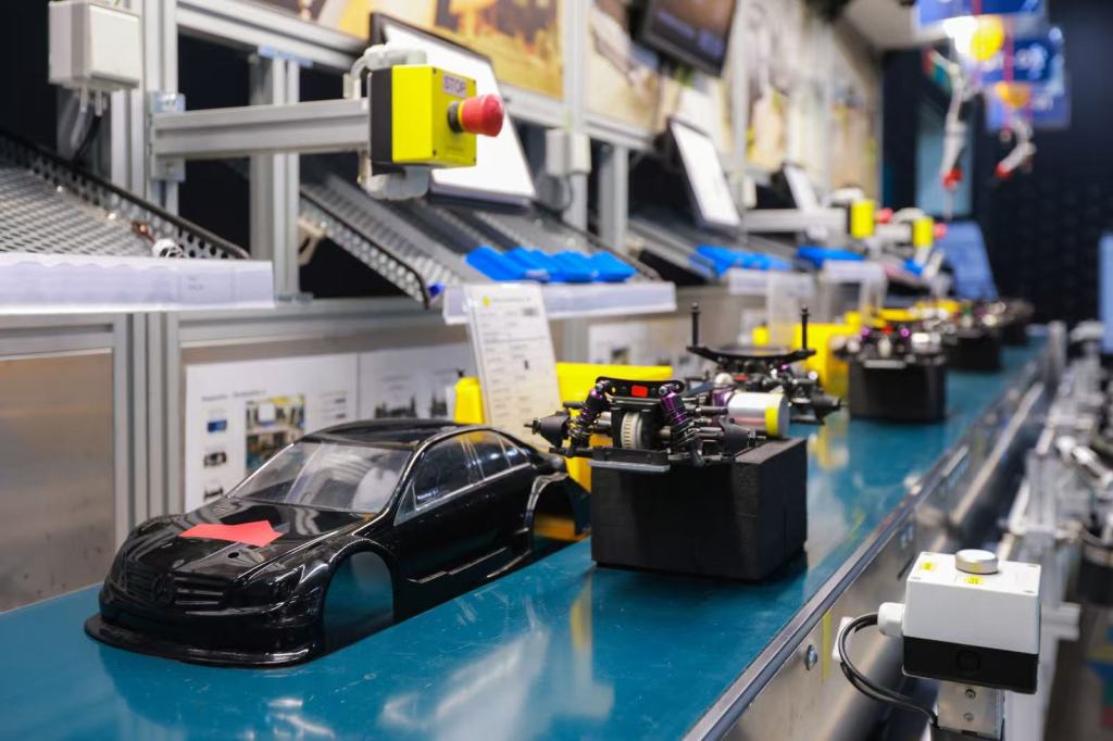 數(shù)十個人被分為若干組,有焊裝、有涂裝、有物流運輸?shù)?,各司其職。雖然是微縮流水線,但生產(chǎn)系統(tǒng)監(jiān)控屏幕、工位上的傳送帶、計件傳感器、打螺絲的電動工具應(yīng)有盡有。