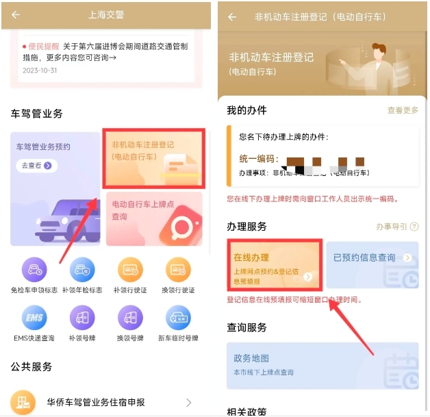 第一步:下滑找到“車駕管業(yè)務(wù)”區(qū)域,點(diǎn)擊“非機(jī)動(dòng)車注冊(cè)登記”—“在線辦理”。