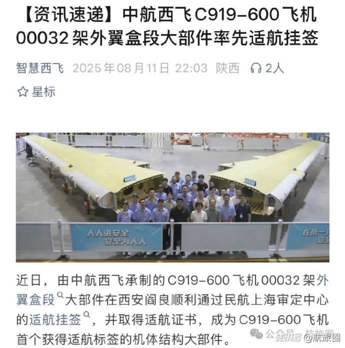 據(jù)中航西飛,近日其承制的C919-600飛機00032架外翼盒段大部件在西安閻良順利通過民航上海審定中心的適航掛簽,并取得適航證書,成為C919-600飛機首個獲得適航標簽的機體結構大部件。