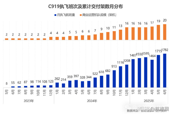 航班管家數(shù)據(jù)顯示,截止2025上半年末,C919商業(yè)載客機隊增長至20架(商飛快線1架未投入商業(yè)運營),執(zhí)飛客運航班量呈現(xiàn)逐月增長的趨勢,6月單月執(zhí)飛近1800班次,同比增長418%。