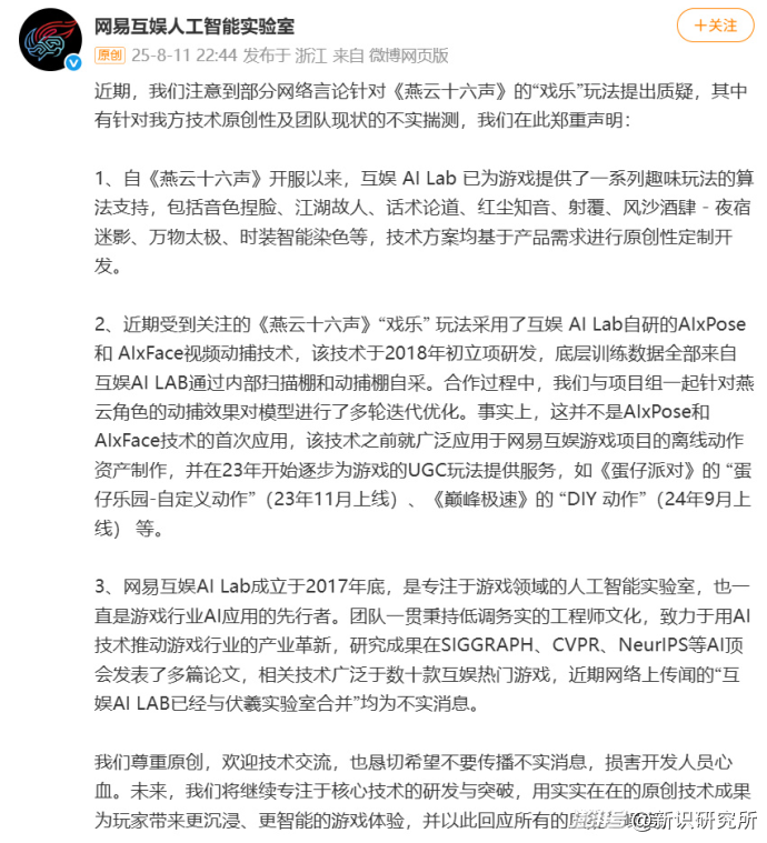 8月11日晚,兩年未更新的“網(wǎng)易互娛人工智能實驗室”連夜找回賬號,發(fā)文稱“戲樂模式”所使用的數(shù)據(jù)均為自主采集,并已在《蛋仔派對》《巔峰極速》等多款網(wǎng)易游戲中實際應(yīng)用。同時,官方明確否認了關(guān)于AI Lab與伏羲實驗室合并的傳聞。