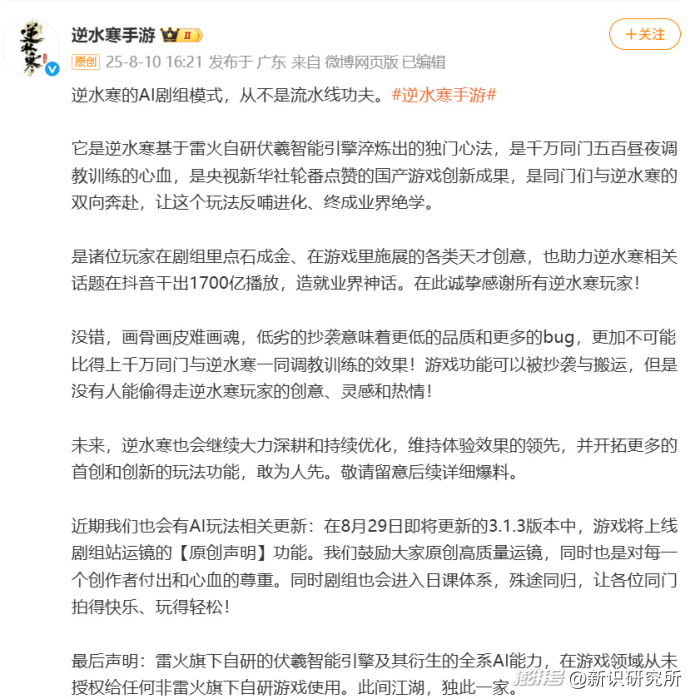 本來只是玩家間的吐槽,沒想到《逆水寒》手游官號帶頭“開團”,8月10日于各大社交平臺發(fā)布公告,稱劇組模式是基于雷火自研的伏羲智能引擎研發(fā)而出,在游戲領(lǐng)域上從未授權(quán)給任何非雷火自研游戲使用,是僅此一家。并直接貼臉諷刺“低劣的抄襲意味著低劣的品質(zhì)和bug”,似乎一點沒給“同門師弟”面子。