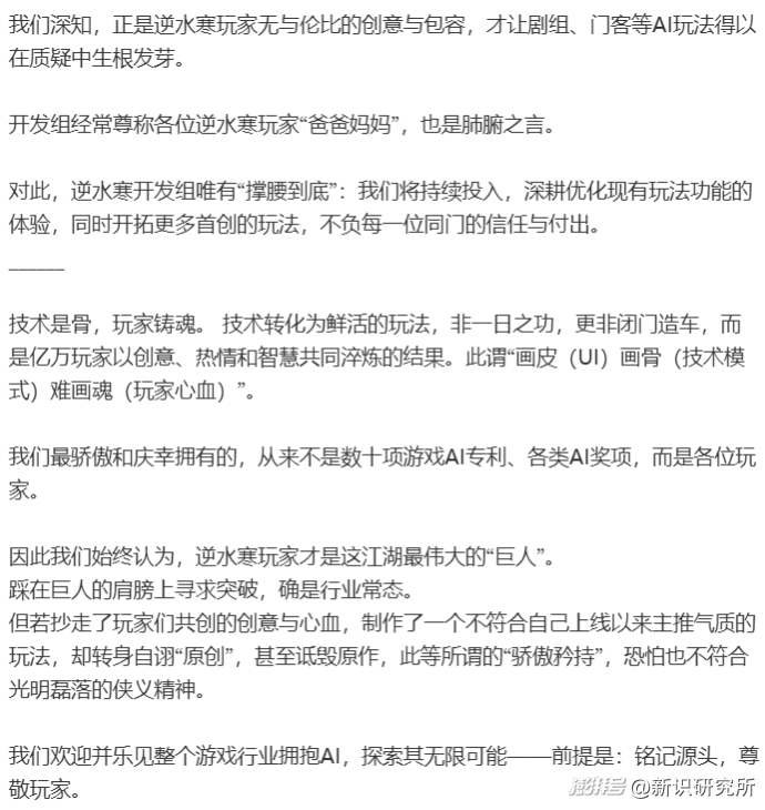 8月12日凌晨,《燕云十六聲》發(fā)布《關(guān)于近期不實傳言的聲明》,轉(zhuǎn)達了AI Lab的相關(guān)說明,并在文末強調(diào):“玩家來玩的是游戲,而不必成為游戲員工‘PLAY’的一環(huán)?!?/p>
