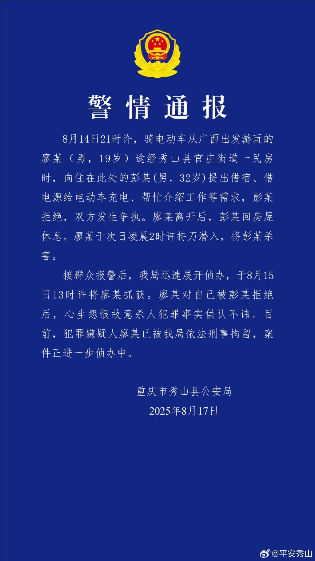 男子拒絕借宿、介紹工作等需求被殺害,重慶秀山警方通報(bào)