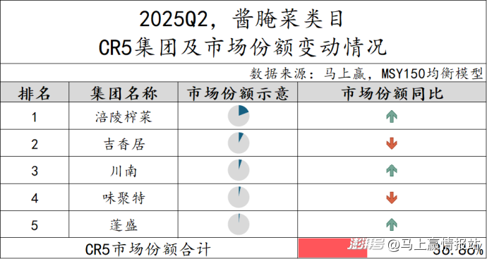 2025年Q2,醬腌菜CR5市場(chǎng)份額合計(jì)為36.86%,集中度較低。龍頭涪陵榨菜保持著領(lǐng)先地位,并保持市場(chǎng)份額同比增長(zhǎng)。與此同時(shí),位于第三和第五的川南、蓬盛市場(chǎng)份額也實(shí)現(xiàn)市場(chǎng)份額同比提升。而吉香居、味聚特的市場(chǎng)份額同比則出現(xiàn)下降。