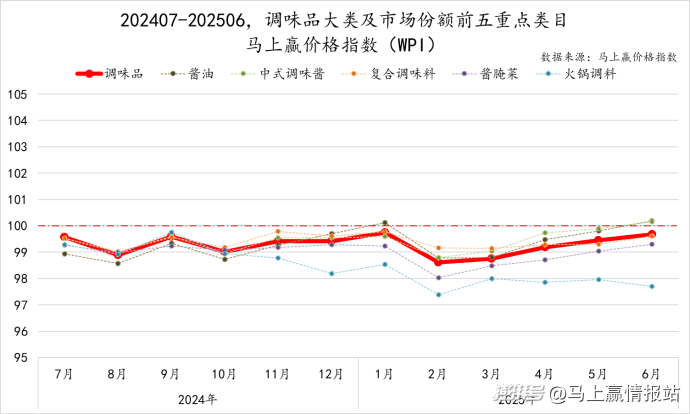 為了更好地分析類(lèi)目?jī)r(jià)格的變動(dòng)與走勢(shì),我們拉取了202407-202506,調(diào)味品類(lèi)目整體及各重點(diǎn)類(lèi)目的馬上贏價(jià)格指數(shù)。該指數(shù)以100為基準(zhǔn)值,其數(shù)值上下波動(dòng)為類(lèi)目的價(jià)格指數(shù)與去年同期價(jià)格指數(shù)的相對(duì)百分比,100表示與去年同月持平,高于100表示同比價(jià)格水平上升,低于100則表示同比價(jià)格水平下降。