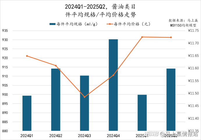 2024Q1至2025Q2期間,醬油類(lèi)目的件均規(guī)格從2024Q1不足900ml到2024Q4高達(dá)930ml,波動(dòng)較大。件均價(jià)格則先降后升,到2025年穩(wěn)定在11.7元左右。相較于2024Q1到Q2的件均規(guī)格上升而件均價(jià)格反降,2025年Q1到2025Q2的件均規(guī)格上升而件均價(jià)格保持相對(duì)穩(wěn)定。