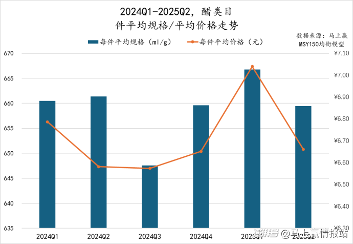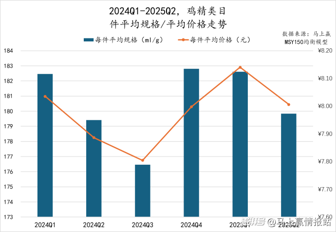 2024Q1至2025Q2,雞精類(lèi)目的件均規(guī)格和件均價(jià)格變化趨勢(shì)基本同步,件均規(guī)格在2024Q4達(dá)到峰值,件均價(jià)格則在2025Q1達(dá)到峰值。