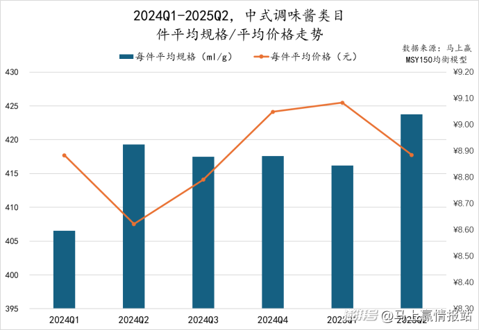 2024Q1至2025Q2,中式調(diào)味醬類(lèi)目產(chǎn)品的件均規(guī)格/件均價(jià)均在波動(dòng)中呈現(xiàn)一定的上升趨勢(shì),Q2是中式調(diào)味醬的件均規(guī)格與件均價(jià)格出現(xiàn)明顯趨勢(shì)變化的關(guān)鍵節(jié)點(diǎn)。2025Q2,中式調(diào)味醬件均規(guī)格上升高達(dá)8g,迎來(lái)觀察期的歷史新高,件均價(jià)格則下降了0.2元左右。