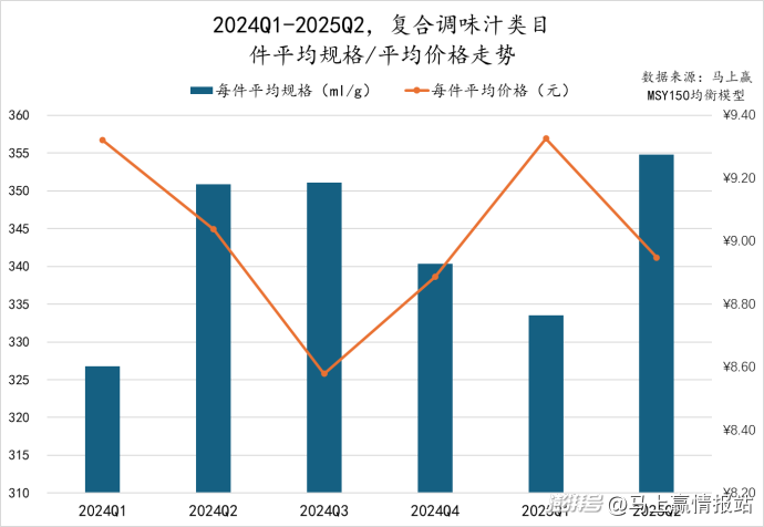 2024Q1至2025Q2,復(fù)合調(diào)味汁類(lèi)目的件均規(guī)格和件均價(jià)格呈現(xiàn)出明顯的季節(jié)波動(dòng),受春節(jié)影響,2024Q1和2025Q1的件均規(guī)格呈現(xiàn)出低谷,而件均價(jià)格則出現(xiàn)峰值。2025Q2,復(fù)合調(diào)味汁類(lèi)目件均規(guī)格上升至峰值,高于去年同期水平,但件均價(jià)格低于去年同期水平,或可說(shuō)明類(lèi)目存在一定的價(jià)格壓力。