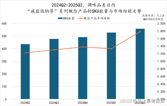 2024Q2至2025Q2,“減鹽、低鈉等”系列產(chǎn)品的SKU數(shù)量保持著穩(wěn)定的增長(zhǎng),市場(chǎng)份額則在2025Q2取得了躍遷式的提升,從之前的1.4%躍升到1.8%。究其原因,一方面,健康消費(fèi)潮流的持續(xù)推動(dòng),以及國(guó)家相關(guān)倡議的出臺(tái)宣貫,都加強(qiáng)了消費(fèi)者對(duì)于這一概念的敏感程度;另一方面,零添加概念的逐漸祛魅或也導(dǎo)致其產(chǎn)品概念下的消費(fèi)者逐漸流出,并流入到其他更有影響力和公信力的產(chǎn)品概念當(dāng)中。