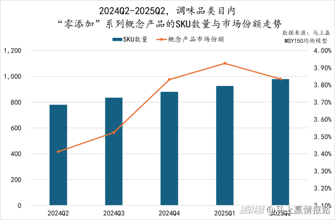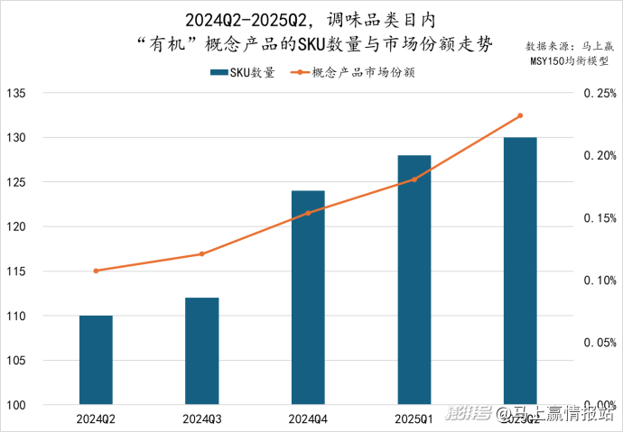 可以看到,2024Q2至2025Q2,“有機(jī)”概念產(chǎn)品的SKU數(shù)量與市場(chǎng)份額走勢(shì)均呈現(xiàn)上升,且其在2025Q1-2025Q2的市場(chǎng)份額有一定程度的加速跡象,雖然目前產(chǎn)品概念在調(diào)味品大類(lèi)中的市場(chǎng)份額占比依然偏低。市場(chǎng)份額的增長(zhǎng)加速推測(cè)可能是由于零添加概念受到相關(guān)法律法規(guī)的限制,部分消費(fèi)者從其他產(chǎn)品概念中流入到有機(jī)產(chǎn)品概念中,進(jìn)行相關(guān)的嘗試。