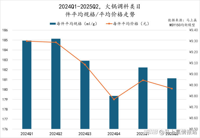 2024Q1-2025Q2,火鍋調(diào)料類(lèi)目的件均規(guī)格和件均價(jià)格走勢(shì)基本同比變化,整體均呈下跌態(tài)勢(shì),或與火鍋蘸料、火鍋底料的小型化趨勢(shì)相關(guān)。