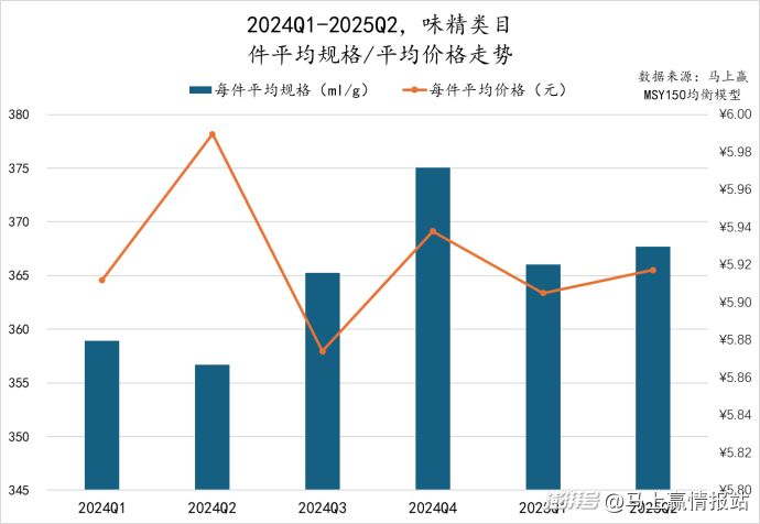 2024Q1至2025Q2,味精類(lèi)目的件均規(guī)格和件均價(jià)格波動(dòng)較大,整體呈上升趨勢(shì)。相較去年同期,2025Q2的件均規(guī)格有較大幅度提升,而件均價(jià)格則明顯下跌,或可說(shuō)明類(lèi)目存在著一定的價(jià)格競(jìng)爭(zhēng)壓力。