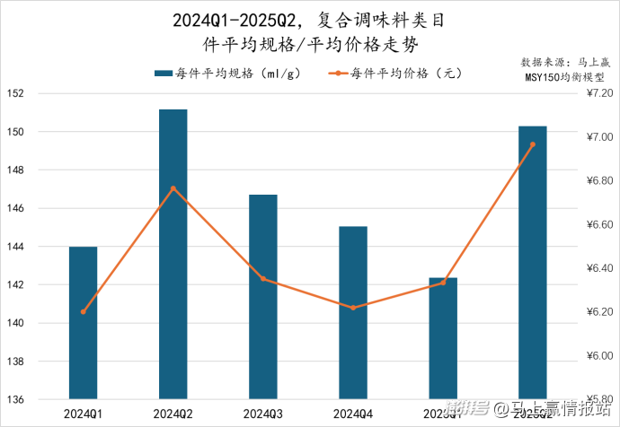 2024年Q1至2025年Q2,復(fù)合調(diào)味料類(lèi)目的件均規(guī)格和件均價(jià)格呈現(xiàn)出同頻波動(dòng),2025Q2均增長(zhǎng)明顯,或受夏季小龍蝦、燒烤等季節(jié)食物及其對(duì)應(yīng)的調(diào)味料用量增長(zhǎng)影響。件均價(jià)格從Q1的6.3元上升至6.9元以上,高于去年同期件均價(jià)。件均規(guī)格增長(zhǎng)至150g以上,低于去年同期水平,顯示復(fù)合調(diào)味料類(lèi)目或存在著一定程度的價(jià)格提升。