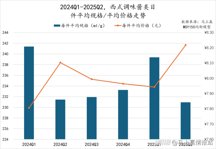 2025Q1至2025Q2以來(lái),西式調(diào)味料的件均規(guī)格與件均價(jià)格呈現(xiàn)明顯的季節(jié)波動(dòng),受春節(jié)影響的2024Q1、2025Q1分別呈現(xiàn)件均規(guī)格峰值和件均價(jià)格最低值。