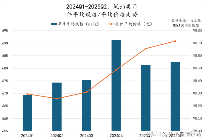 2024Q1至2025Q2,蠔油類(lèi)目的件均價(jià)格和件均規(guī)格均呈現(xiàn)上漲趨勢(shì),2024Q4的件均規(guī)格達(dá)到峰值超過(guò)690ml。件均價(jià)格從2024Q2的8.2元逐季攀升,在2025Q2超過(guò)8.7元。