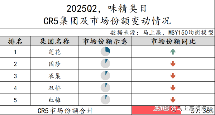 2025Q2,味精類(lèi)目的CR5市場(chǎng)份額合計(jì)為59.36%,分別由蓮花、國(guó)莎、雀巢、雙橋和紅梅集團(tuán)構(gòu)成。其中,僅頭部品牌蓮花的市場(chǎng)份額同比呈現(xiàn)上升,而其后的四個(gè)品牌市場(chǎng)份額同比均出現(xiàn)下跌。