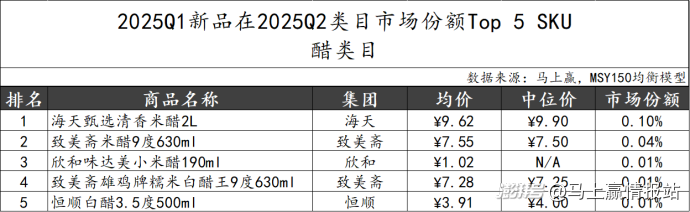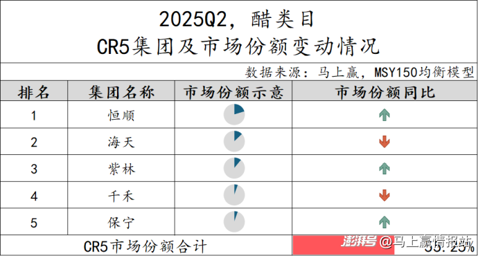 2025Q2,醋類(lèi)目的CR5市場(chǎng)份額合計(jì)為55.25%,由恒順、海天、紫林、千禾和保寧構(gòu)成,集中度處于中等水平。其中,恒順市場(chǎng)份額顯著高于其它集團(tuán),且市場(chǎng)份額同比增長(zhǎng)。市場(chǎng)份額同比上升的還有紫林和保寧兩家集團(tuán),而海天、千禾則出現(xiàn)市場(chǎng)份額同比下降的趨勢(shì)。