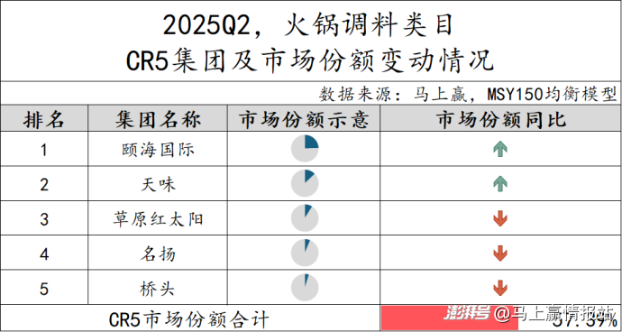 2025Q2,火鍋調(diào)料類(lèi)目CR5市場(chǎng)份額合計(jì)為57.39%。從市場(chǎng)份額同比變化來(lái)看,排名第一和第二的頤海國(guó)際、天味市場(chǎng)份額進(jìn)一步提升,其后的草原紅太陽(yáng)、名揚(yáng)、橋頭則呈現(xiàn)市場(chǎng)份額同比下降。