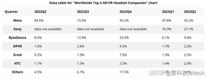 在隨后數(shù)年時(shí)間里,VR市場(chǎng)不斷萎縮,而HTC卻始終堅(jiān)持著高價(jià)高配的產(chǎn)品策略,銷(xiāo)量自然是連年下滑。根據(jù)IDC數(shù)據(jù),HTC的市占率在2023年第三季度已下滑至1~2.5%,而曾經(jīng)的手下敗將則以超過(guò)50%的市占比穩(wěn)居第一。