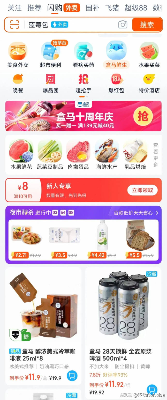 ▲淘寶首頁「閃購」入口上線「盒馬生鮮專區(qū)」