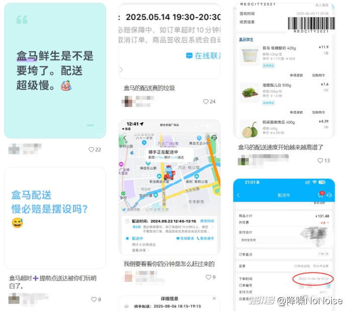 服務(wù)能力方面,線上履約是盒馬的核心競爭力之一。隨著規(guī)模增長和與阿里的業(yè)務(wù)聯(lián)動日漸頻繁,盒馬有必要重視運力瓶頸和配送算法能力。在8月初淘寶88VIP可領(lǐng)盒馬會員后,盒馬會員數(shù)量翻倍的同時,帶來訂單激增,隨之而來的就是履約能力明顯跟不上節(jié)奏。小紅書上,不少用戶吐槽配送變慢,「兩小時訂單還沒送到」的抱怨聲屢見不鮮。