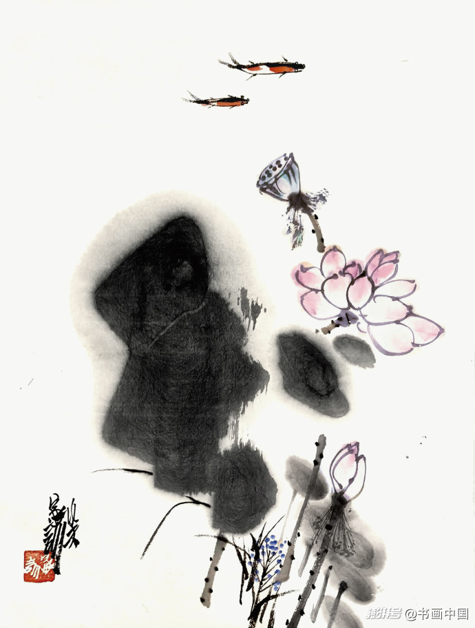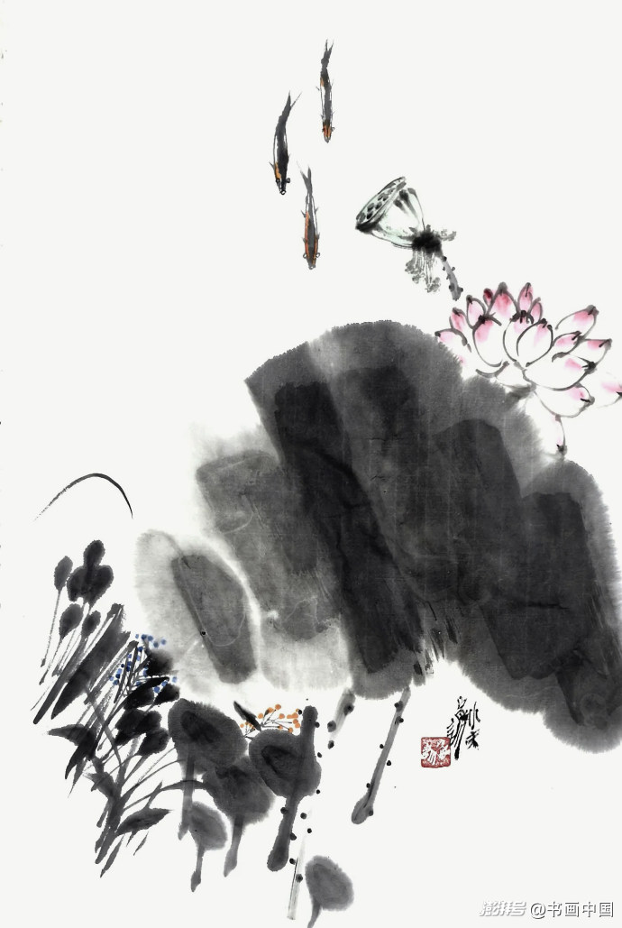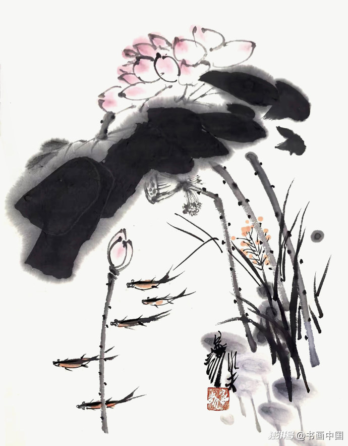 王家訓的荷花,從不孤立存在。他常于荷塘中添幾只游魚、一對蜻蜓,或幾筆蘆葦、數(shù)點苔石。這些“配角”看似隨意,實則暗藏巧思。游魚用焦墨輕點,尾鰭一帶便有戲水之姿,與荷葉的厚重形成虛實對比;蜻蜓以細筆勾翅,停在花苞上,似動非動,為靜謐的荷塘添了幾分生趣。他尤擅留白,水面常以空白代之,讓觀者在想象中補足波光粼粼的意境,所謂“計白當黑”,正是如此。