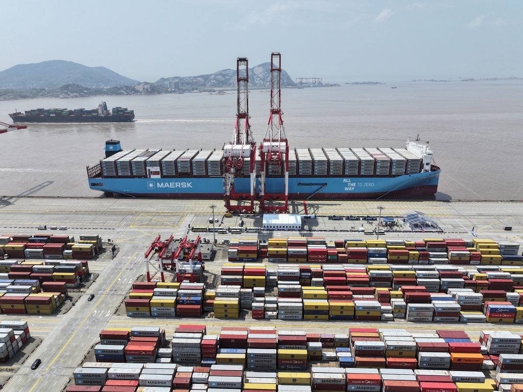 2024年4月10日,上海洋山深水港三期碼頭,全球最大甲醇加注船“海港致遠(yuǎn)”輪搭靠甲醇動力集裝箱貨輪“阿斯特麗德馬士基”輪并實(shí)施加注保稅綠色甲醇燃料作業(yè)。