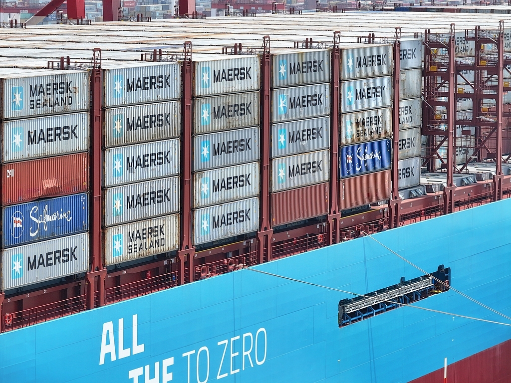 2024年4月10日,上海洋山深水港三期碼頭,全球最大甲醇加注船“海港致遠(yuǎn)”輪搭靠甲醇動力集裝箱貨輪“阿斯特麗德馬士基”輪并實(shí)施加注保稅綠色甲醇燃料作業(yè)。視覺中國 圖