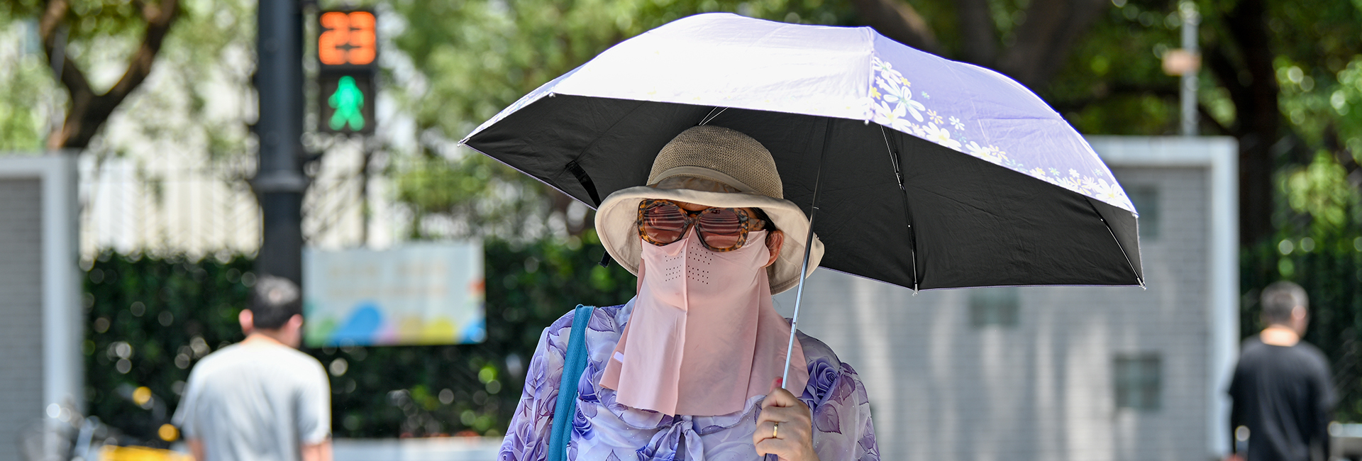 市民戴著防曬面罩,撐著傘出行。澎湃新聞?dòng)浾?朱偉輝 圖