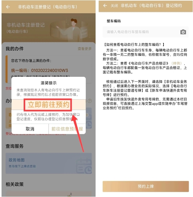 第二步:根據(jù)提示點擊“立即前往預(yù)約”,跳轉(zhuǎn)登記預(yù)約頁面,輸入您的整車編碼后點擊“預(yù)約上牌”。
