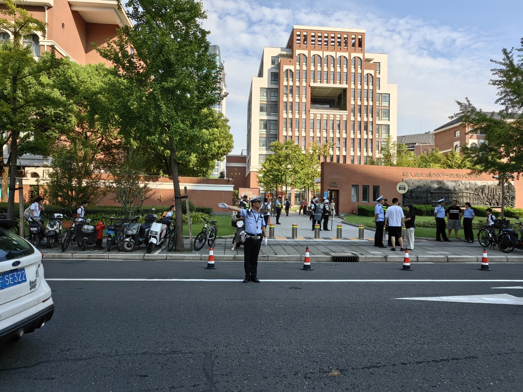 民警在南洋中學(xué)門口排堵保暢。 上海市公安局 供圖