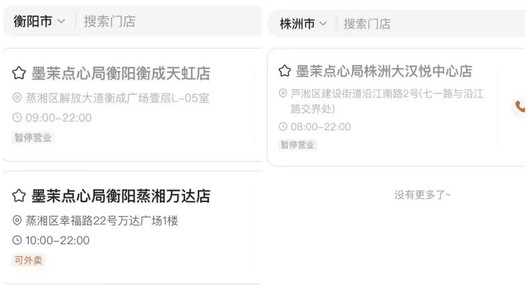 據(jù)其小程序信息,此次關掉株洲、衡陽2家門店之后,墨茉點心局在湖南市州目前僅衡陽有一家門店。