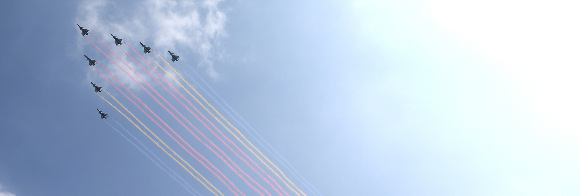 7架戰(zhàn)機在空中劃出14道彩煙,寓意著中華民族14年可歌可泣的抗戰(zhàn)歷程,象征著14億多中國人民奔向強國復興的光明前景。