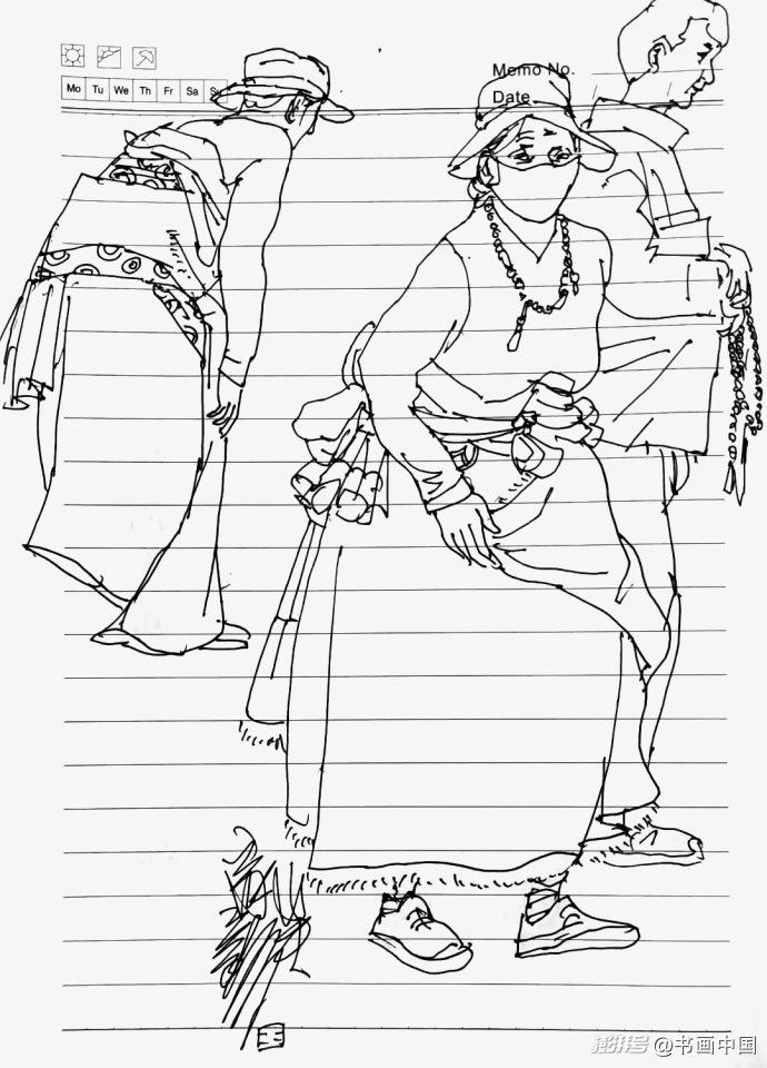 在王家訓(xùn)的速寫中,線條是最基本也是最核心的語言。他的線條并非簡單的輪廓勾勒,而是承載著豐富的情感與意義。流暢飄逸,頓挫有力。這些線條隨著人物的形態(tài)、神情而變化,或疏或密,或輕或重,形成了富有節(jié)奏感和韻律感的視覺效果。通過線條的巧妙運用,他成功地捕捉到了人物特有的氣質(zhì)與精神面貌,讓觀者能夠透過線條感受到人物內(nèi)在的生命力。