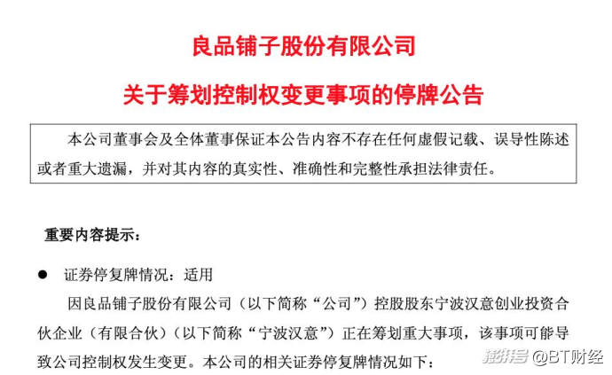 鑒于該事項(xiàng)正在洽談中,尚存在不確定性,為保證公平信息披露,維護(hù)投資者利益,避免造成公司股價(jià)異常波動(dòng),良品鋪?zhàn)幼?月11日起開(kāi)始停牌,預(yù)計(jì)停牌時(shí)間不超過(guò)2個(gè)交易日。