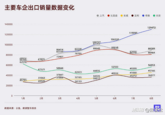 從成果看,奇瑞仍然是海外市場表現(xiàn)最好的企業(yè),8月海外交付12.94萬臺,奇瑞的增長勢頭非常明顯,從5月突破10萬臺后一路扶搖直上。
