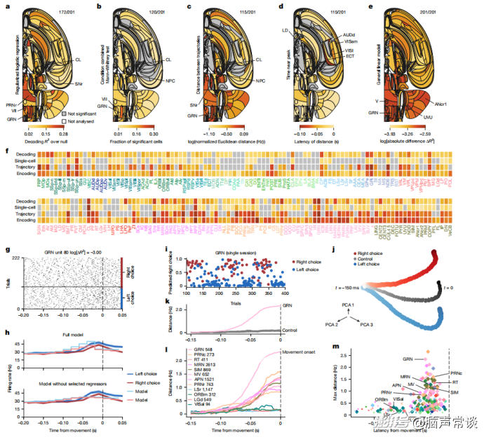 群體軌跡分析進一步顯示,左與右選擇的神經(jīng)活動軌跡在多個腦區(qū)分離,尤其在GRN等腦干區(qū)域最明顯,表明這些區(qū)域在決策或動作準備中起關鍵作用。
