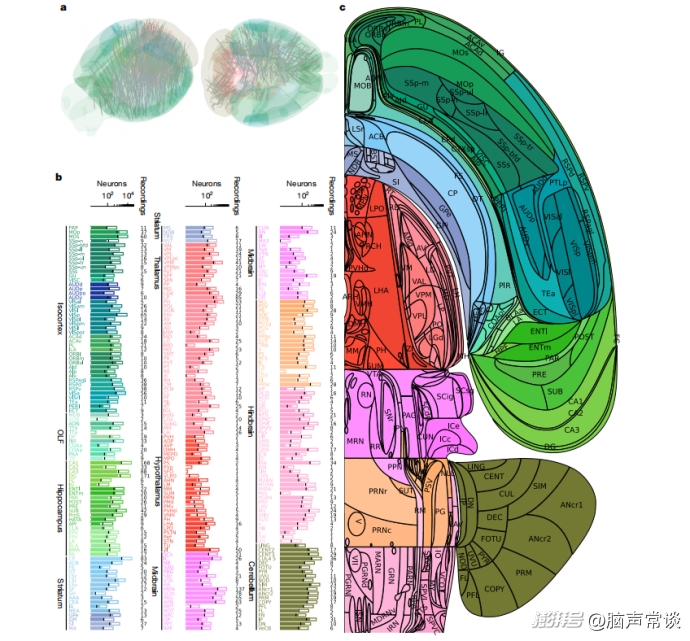 作者共識別出62萬多個信號單元,經(jīng)嚴格質控篩選出7.5萬多個清晰分離的單神經(jīng)元(平均每個探針108個)。通過雙光子顯微鏡重建探針軌跡,將每個神經(jīng)元定位至艾倫腦圖譜中的具體區(qū)域。