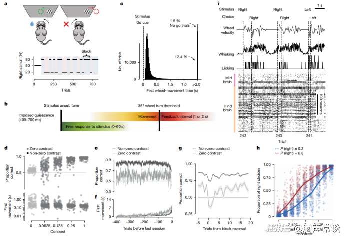 在訓練小鼠完成感知決策任務時,每個試驗塊中刺激出現(xiàn)在左側或右側的先驗概率固定為20:80或80:20,塊長隨機(20–100次),切換無提示。刺激對比度有5個等級,0%對比度時無視覺輸入,但小鼠可依據(jù)當前塊的偏向概率做選擇。通過飲水獎勵或白噪音反饋進行學習。