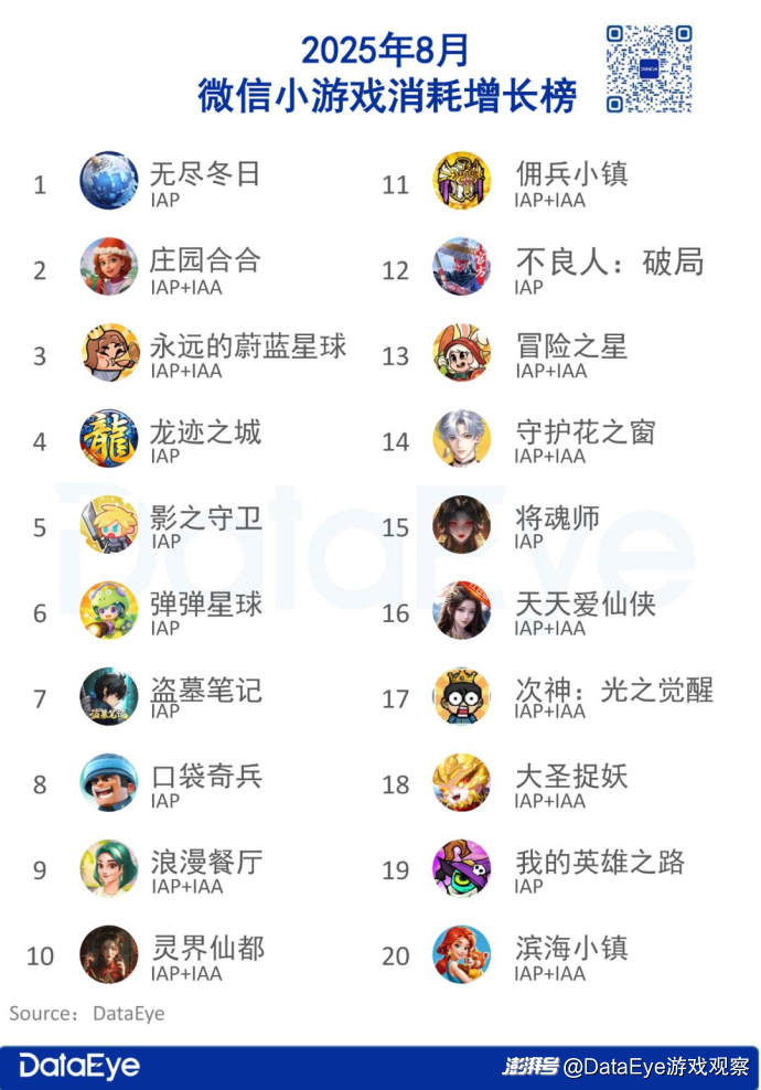 8 月 消耗增長榜中,《無盡冬日》在8月增長突出,排名月增長第一,并在月度消耗榜層面上超過同類型競品《三國:冰河時(shí)代》。除此之外,《莊園合合》和《永遠(yuǎn)的蔚藍(lán)星球》排名月度消耗增長第二、三名,同時(shí)也順利進(jìn)入月度消耗榜TOP20。