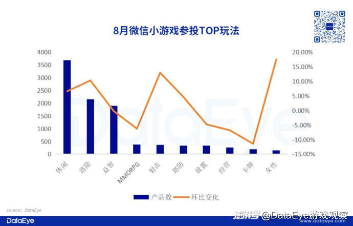 在8月參投微信小游戲玩法TOP10分類中,休閑排名TOP玩法第一,消除排名第二,益智類排名第三。整體來看,MMORPG、放置、經(jīng)營和卡牌品類環(huán)比下滑,而女性向品類則增長明顯。