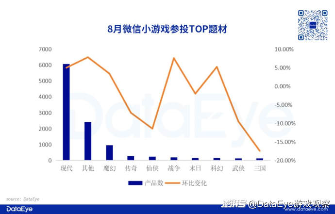 參投微信小游戲題材TOP10分類中,現(xiàn)代、其他、魔幻排名前三。8月戰(zhàn)爭題材游戲數(shù)增長最多,環(huán)比提升接近10%。仙俠和三國題材是熱投題材TOP10中降幅最多的題材,傳統(tǒng)題材持續(xù)疲軟。