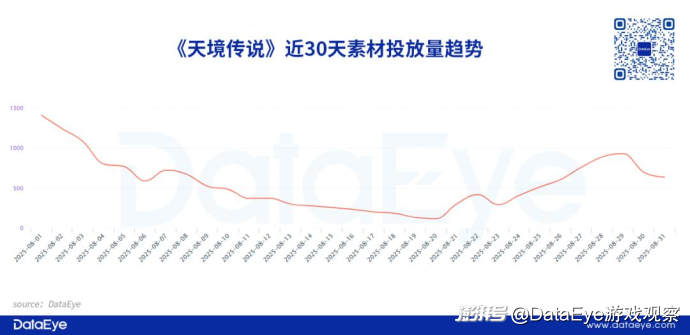 《天境傳說》由冰川網(wǎng)絡(luò)發(fā)行,屬于放置卡牌品類。DataEye-ADX投放數(shù)據(jù)顯示,8月投放素材量整體強(qiáng)勢,8月中有明顯回落,而月尾則繼續(xù)拉升。