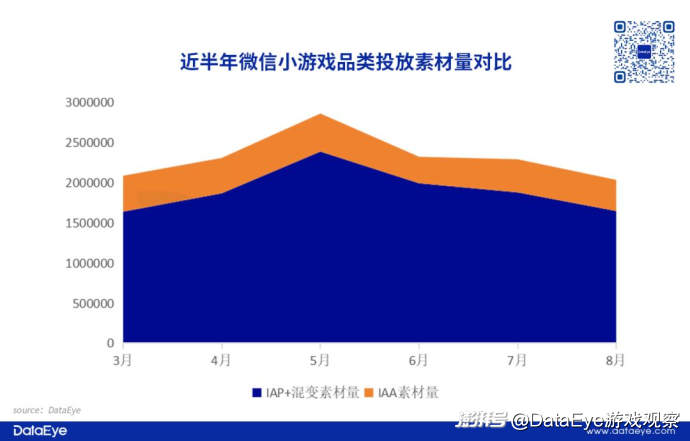 素材量 方面,DataEye-ADX投放數(shù)據(jù)顯示,8月微信小游戲投放素材量 (圖片+視頻)約為203萬,環(huán)比7月下滑11.2%。8月小游戲市場進(jìn)入暑期檔尾期,部分廠商逐漸降低素材投放量。從降幅來看,IAP+混變游戲相關(guān)素材下滑超過12%。